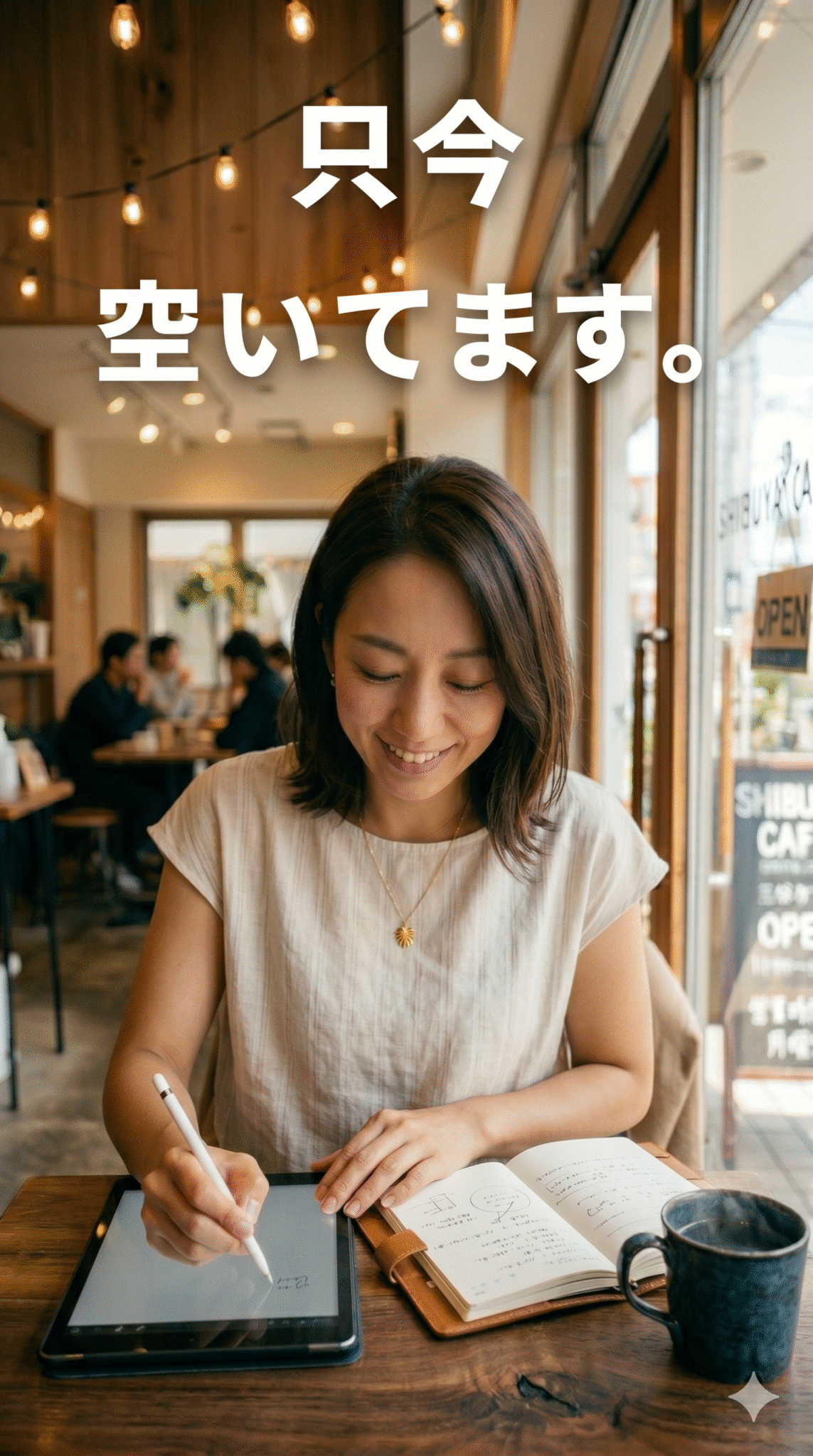 『お気に入りのノートやタブレットを傍らに、少し明るい表情で何かを書き留める30代女性。』画像を作って、『縦型で。